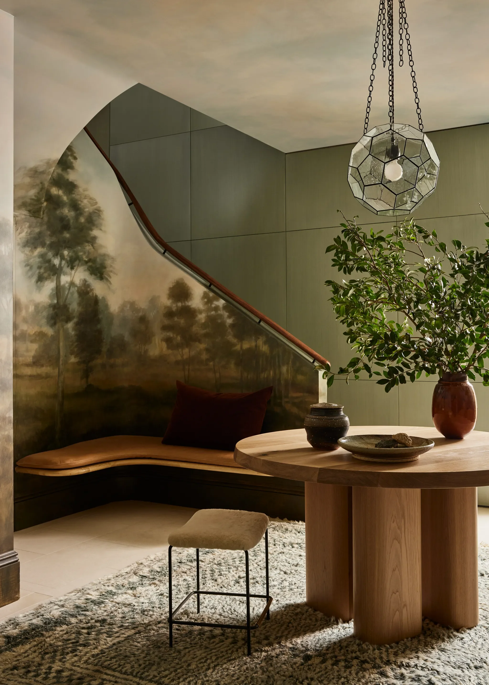 “The Dean Barger mural in the entryway sets the tone for the rest of the house. “It’s a very important space, because that’s where you wait when not everyone’s ready to go,” says Adler. “You spend a surprising amount of time there arriving or leaving, so the character of it matters a tremendous amount.”’